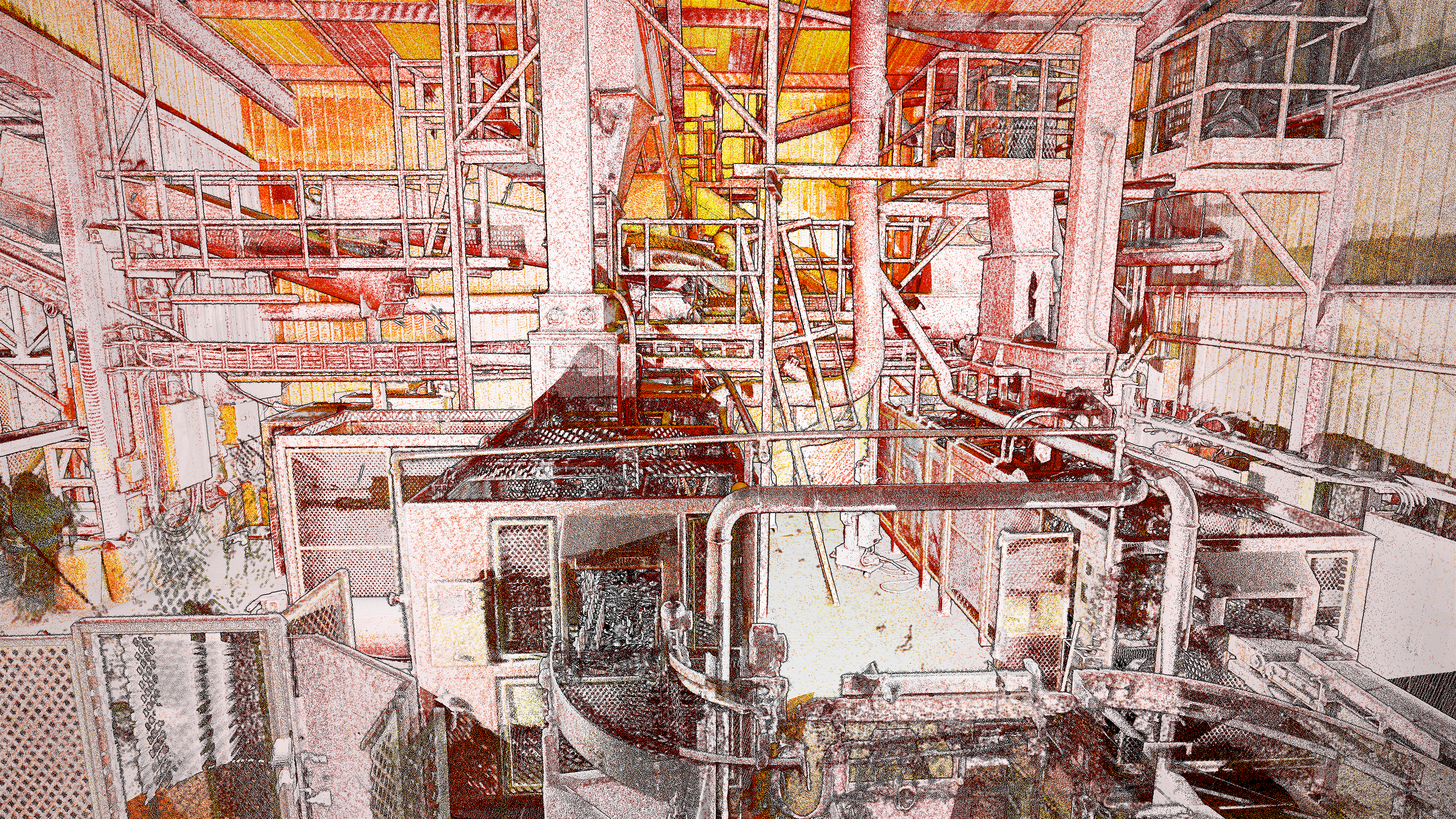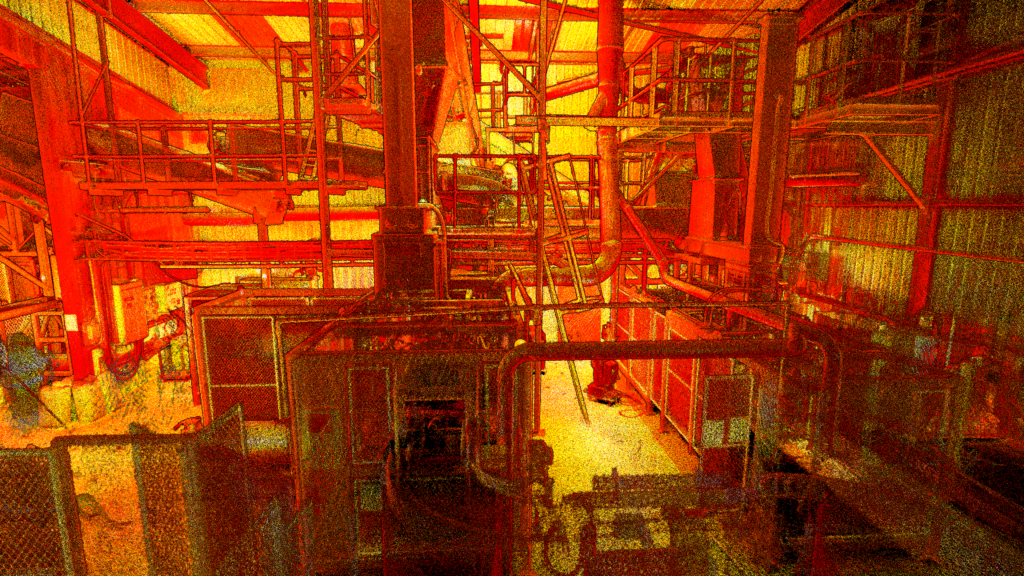 The image above is a Riegl VZ400i scanThis image is taken from the Hovermap ST from the same location.The plant was working at the time of the survey. The Riegl VZ400i was used at ground floor level. There were several levels of mezzanine floors which were vibrating and therefore not suitable for a Terrestrial Laser Scanner on a Tripod. The Hovermap ST was utilised to fill in any shadows and undertake the work on the mezzanine floors.